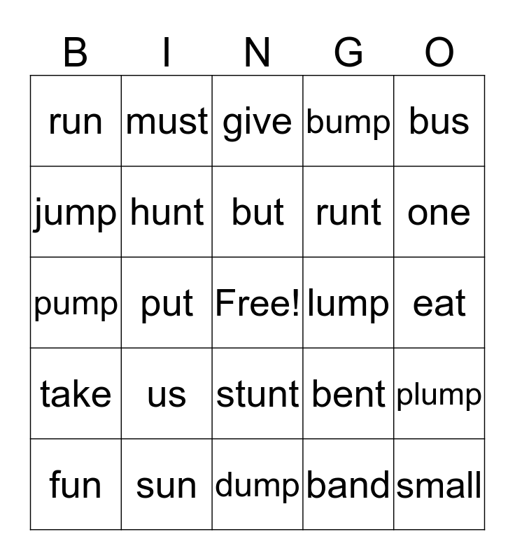 This bingo card has a free space and 24 words: us, sun, but, fun, bus, run, jump, must, lump, stunt, runt, pump, bent, plump, hunt, band, eat, give, one, put, small, take, bump and dump.