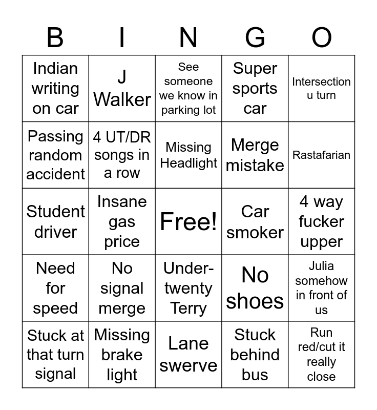 This bingo card has a free space and 24 words: No signal merge, Missing brake light, Missing Headlight, Stuck at that turn signal, Intersection u turn, Indian writing on car, Passing random accident, J Walker, Car smoker, Under-twenty Terry, Merge mistake, Student driver, No shoes, Julia somehow in front of us, 4 UT/DR songs in a row, Stuck behind bus, 4 way fucker upper, See someone we know in parking lot, Rastafarian, Insane gas price, Run red/cut it really close, Need for speed, Super sports car and Lane swerve.