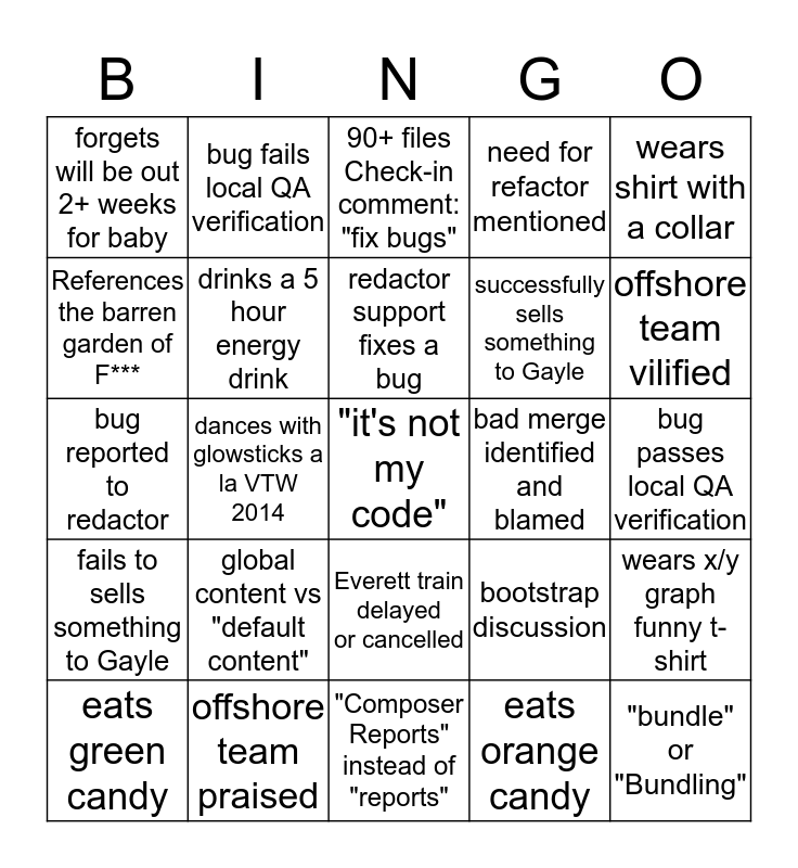 This bingo card has a free space and 24 words: global content vs "default content", offshore team praised, redactor support fixes a bug, eats green candy, wears shirt with a collar, forgets will be out 2+ weeks for baby, References the barren garden of F***, bug fails local QA verification, bad merge identified and blamed, Everett train delayed or cancelled, successfully sells something to Gayle, bug reported to redactor, bootstrap discussion, wears x/y graph funny t-shirt, drinks a 5 hour energy drink, eats orange candy, bug passes local QA verification, 90+ files Check-in comment: "fix bugs", offshore team vilified, dances with glowsticks a la VTW 2014, "bundle" or "Bundling", fails to sells something to Gayle, need for refactor mentioned and "Composer Reports" instead of "reports".