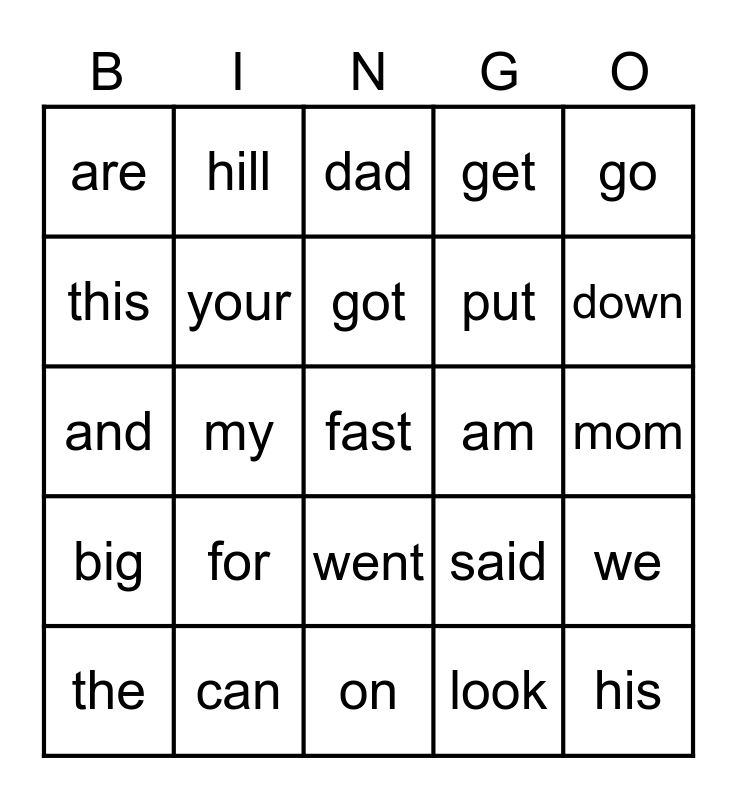 This bingo card has 25 words: for, on, got, the, go, are, this, hill, am, went, put, and, said, we, your, his, mom, dad, down, my, fast, can, big, get and look.