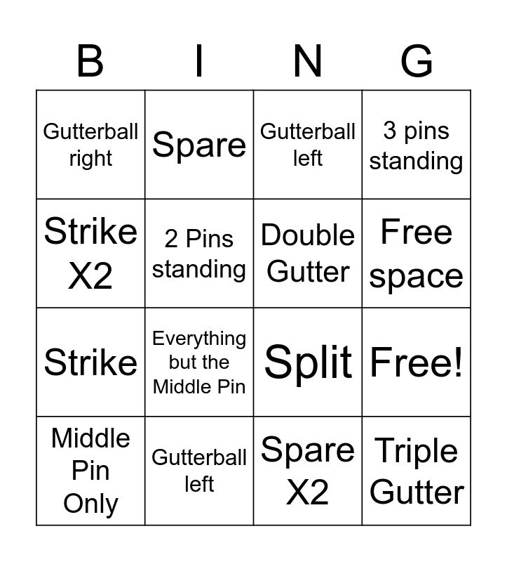 This bingo card has 16 words: Gutterball left, Free!, Gutterball left, Gutterball right, Strike, Spare, Split, Spare X2, Strike X2, 2 Pins standing, Middle Pin Only, 3 pins standing, Everything but the Middle Pin, Free space, Double Gutter and Triple Gutter.
