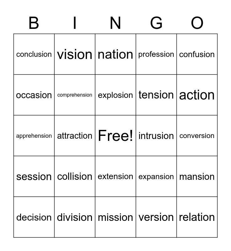 This bingo card has a free space and 24 words: collision, division, explosion, decision, confusion, conclusion, occasion, vision, intrusion, extension, tension, apprehension, expansion, mansion, comprehension, version, conversion, nation, action, attraction, relation, session, profession and mission.