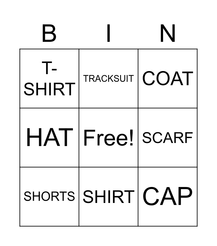 This bingo card has a free space and 14 words: JEANS, SWEATSHIRT, SHORTS, TRACKSUIT, HAT, CAP, SHOES, TRAINERS, SHIRT, T-SHIRT, JACKET, SCARF, COAT and SOCKS.