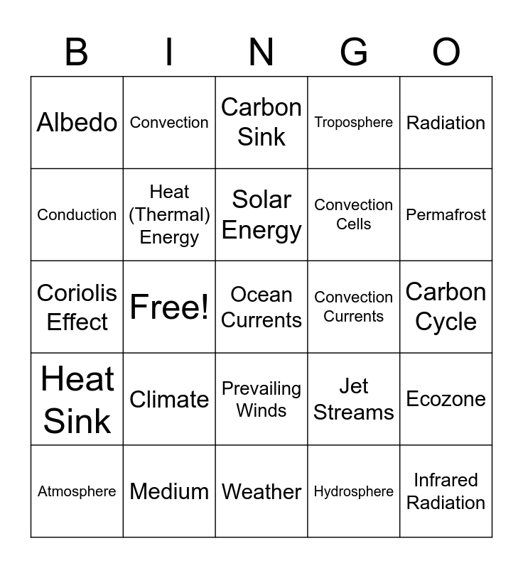 This bingo card has 25 words: Climate, Weather, Solar Energy, Atmosphere, Radiation, Albedo, Conduction, Convection, Convection Currents, Prevailing Winds, Convection Cells, Coriolis Effect, Jet Streams, Ecozone, Heat (Thermal) Energy, Infrared Radiation, Carbon Cycle, Carbon Sink, Permafrost, Free!, Ocean Currents, Medium, Heat Sink, Troposphere and Hydrosphere.