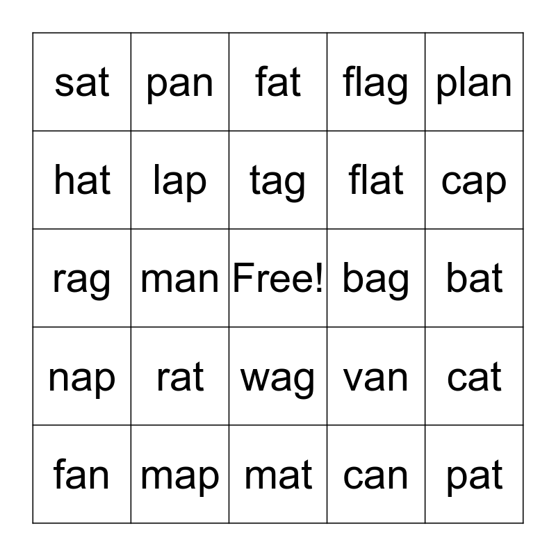 This bingo card has a free space and 24 words: rat, map, tag, fan, plan, sat, hat, pan, bag, wag, flat, rag, van, cat, lap, can, bat, fat, cap, man, pat, nap, flag and mat.