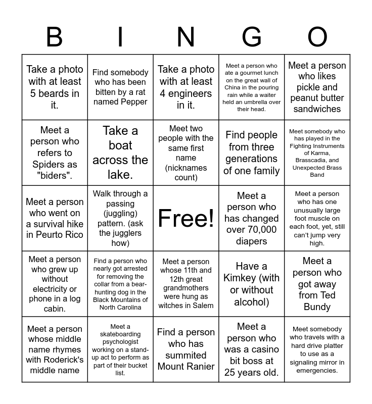 This bingo card has a free space and 51 words: Meet a person who has climbed 25 feet up a giant sequoia., Meet somebody who travels with a hard drive platter to use as a signaling mirror in emergencies., Meet a person who collects rocking chairs., Find a person who has summited Mount Ranier, Find a person who nearly got arrested for removing the collar from a bear-hunting dog in the Black Mountains of North Carolina, Find a person older than 50 who has had less than one cup of coffee in their life, Find somebody who has been bitten by a rat named Pepper, Meet a person who took a 7 month bicycle journey to Central America, Meet a person who refers to Spiders as "biders"., Complete the challenge course with your team., Take a boat across the lake., Meet a person who ate a gourmet lunch on the great wall of China in the pouring rain while a waiter held an umbrella over their head., Meet a person who got away from Ted Bundy, Have a Kimkey (with or without alcohol), Have a Lackball (with or without alcohol), once accidentally auditioned to be a Ringling Brothers & Barnum & Bailey showgirl, and made it through about 3 rounds of eliminations before being cut, Meet two people with the same first name (nicknames count), Meet a person who has changed over 70,000 diapers, Meet a person who has had 3 crossword puzzles in the New York Times, Meet a person who likes pickle and peanut butter sandwiches, Walk through a passing (juggling) pattern. (ask the jugglers how), Meet a person who was a casino bit boss at 25 years old., Take a photo with at least 5 beards in it., Find people from three generations of one family, Meet a person who has sailed around the world solo (twice!), Meet a person who went to school with both Roderick & Lacy, Meet somebody who has played in the Fighting Instruments of Karma, Brasscadia, and Unexpected Brass Band, Meet a person who drove a pink duct taped junker car in a demolition derby and received a standing ovation for the brutal hit they made to the car that ended up winning the whole thing., Meet a person whose middle name rhymes with Roderick's middle name, Take a photo with at least 4 engineers in it., Meet a person who lives in a renovated church, Meet a person who ranked 3rd in tennis in the state of Indiana in the 16 & under division, Meet a person whose college admissions essay was titled "Nudist to Buddhist", Meet a person who had a chicken that lived to be 13 years old., Meet a person who has owned 5 NA Miyatas in their life., Meet a skateboarding psychologist working on a stand-up act to perform as part of their bucket list., Meet a person who has a seed bank, Meet an entertainer who has been forced off stage by the armies of two different countries in one month., Meet a person who lived at a whale museum with their dog Zachary and slept next to an Orca skeleton., Meet a person who BB King once asked to marry him., Meet a person who has one unusually large foot muscle on each foot, yet, still can’t jump very high., Meet a person who grew up without electricity or phone in a log cabin., Meet a person who discovered only five years ago that the composer of the New Chumleighland March was their cousin., Meet a person whose childhood best friend was their brother, Chris, who had Down syndrome, and was on of the best teachers they ever had., Meet a person who is currently in school for farming., Meet a person who makes micro bouquets, Meet a person who went on a survival hike in Peurto Rico, Meet a person who had a police escort while doing emergency relief work because they had access to millions of dollars of funds., Meet a person who has spent 2 months in Iceland over 3 separate trips., Meet a person whose 11th and 12th great grandmothers were hung as witches in Salem and Meet a person who owns more than 40 types of cameras.
