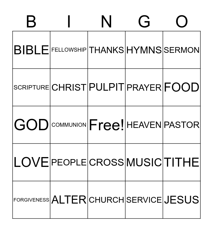 This bingo card has a free space and 24 words: PEOPLE, ALTER, PULPIT, FORGIVENESS, SERMON, BIBLE, SCRIPTURE, FELLOWSHIP, HEAVEN, CROSS, PRAYER, GOD, MUSIC, TITHE, CHRIST, SERVICE, PASTOR, THANKS, FOOD, COMMUNION, JESUS, LOVE, HYMNS and CHURCH.