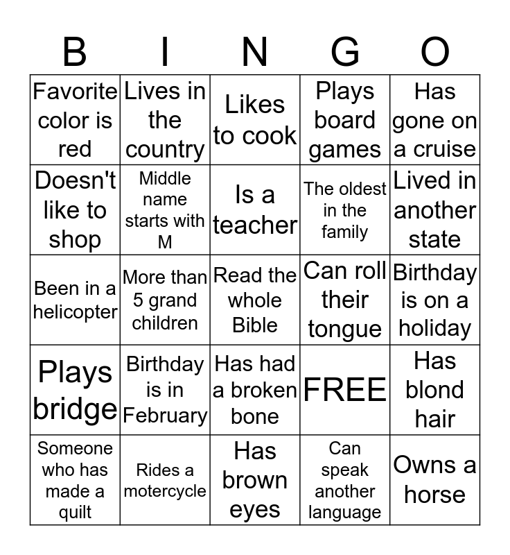 This bingo card has 25 words: Birthday is in February, Has brown eyes, Is a teacher, Someone who has made a quilt, Has gone on a cruise, Favorite color is red, Doesn't like to shop, Lives in the country, Can roll their tongue, Has had a broken bone, The oldest in the family, Been in a helicopter, FREE, Has blond hair, Middle name starts with M, Owns a horse, Birthday is on a holiday, Likes to cook, Lived in another state, More than 5 grand children, Read the whole Bible, Rides a motercycle, Plays bridge, Plays board games and Can speak another language.