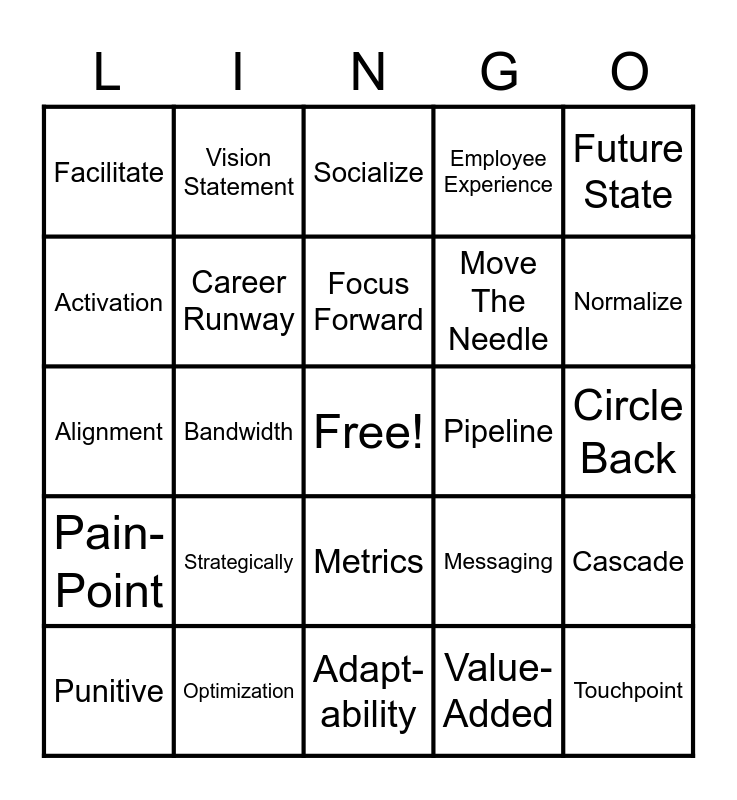 This bingo card has a free space and 24 words: Strategically, Optimization, Focus Forward, Punitive, Future State, Facilitate, Activation, Vision Statement, Pipeline, Metrics, Move The Needle, Alignment, Messaging, Cascade, Career Runway, Value-Added, Circle Back, Socialize, Normalize, Bandwidth, Touchpoint, Pain-Point, Employee Experience and Adapt-ability.
