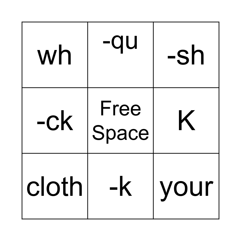 This bingo card has a free space and 8 words: K, -sh, -qu, cloth, wh, your, -ck and -k.