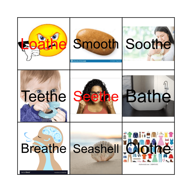 This bingo card has 8 images, a free space and 8 words: Bathe, Soothe, Smooth, Breathe, Loathe, Clothe, Teethe and Seashell.