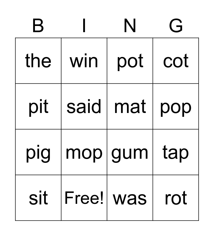 This bingo card has 25 words: what, why, pop, nut, pit, the, said, win, Free!, tip, pig, gum, top, snap, mat, tan, was, pot, mop, tap, sit, set, rot, cot and if.