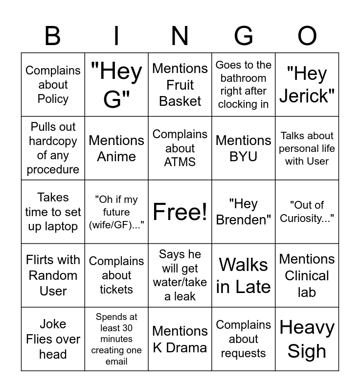 This bingo card has a free space and 24 words: Joke Flies over head, Complains about tickets, Complains about ATMS, Complains about requests, "Hey Jerick", Complains about Policy, "Hey G", Mentions Fruit Basket, "Hey Brenden", "Out of Curiosity...", Takes time to set up laptop, Mentions Anime, Walks in Late, Mentions Clinical lab, Pulls out hardcopy of any procedure, Spends at least 30 minutes creating one email, Mentions K Drama, Goes to the bathroom right after clocking in, Talks about personal life with User, Flirts with Random User, "Oh if my future (wife/GF)...", Says he will get water/take a leak, Mentions BYU and Heavy Sigh.