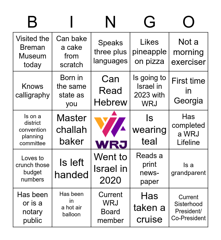 This bingo card has a free space and 29 words: Has been or is a notary public, First Timer at a WRJ in-person gathering, Master challah baker, Attended a URJ Summer Camp, Visited the Breman Museum today, Speaks three plus languages, Born in the same state as you, Is left handed, Is wearing teal, Has been in a hot air balloon, Has completed a WRJ Lifeline, Current Sisterhood President/ Co-President, Current WRJ Board member, Has taken a cruise, First time in Georgia, Has been to a URJ North American biennial, Went to Israel in 2020, Loves to crunch those budget numbers, Not a morning exerciser, Is on a district convention planning committee, Reads a print news-paper, Has led or taught on a zoom webinar, Is going to Israel in 2023 with WRJ, Knows calligraphy, Likes pineapple on pizza, Can bake a cake from scratch, Is a grandparent, Can Read Hebrew and Has been to Alabama before.