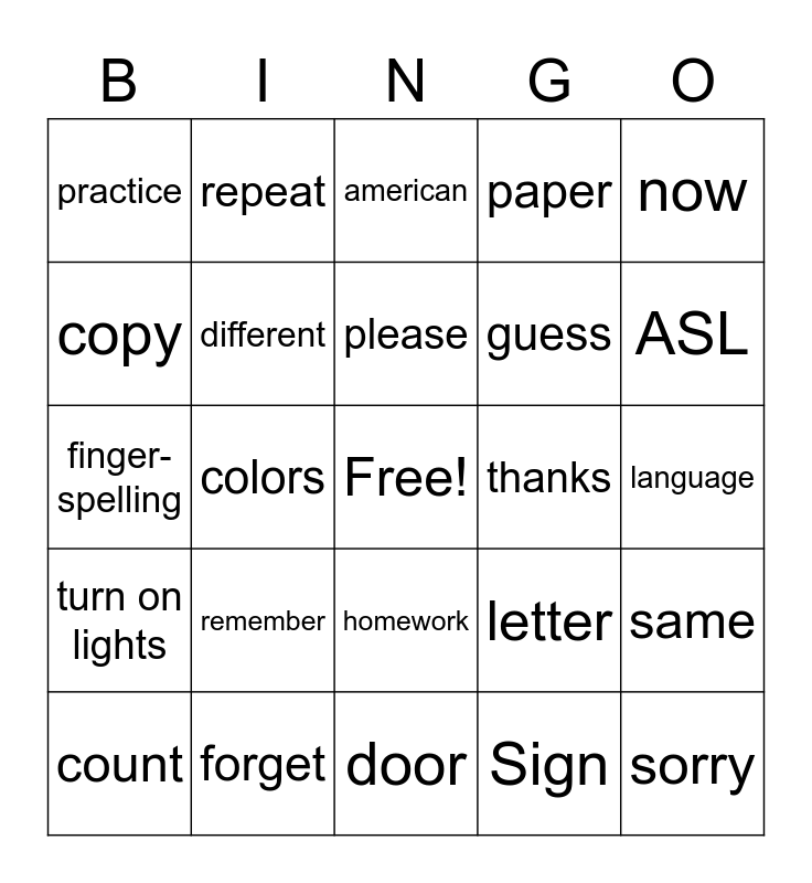 This bingo card has a free space and 24 words: remember, forget, please, count, now, practice, copy, repeat, thanks, homework, guess, finger-spelling, letter, same, different, Sign, language, american, ASL, colors, sorry, turn on lights, paper and door.
