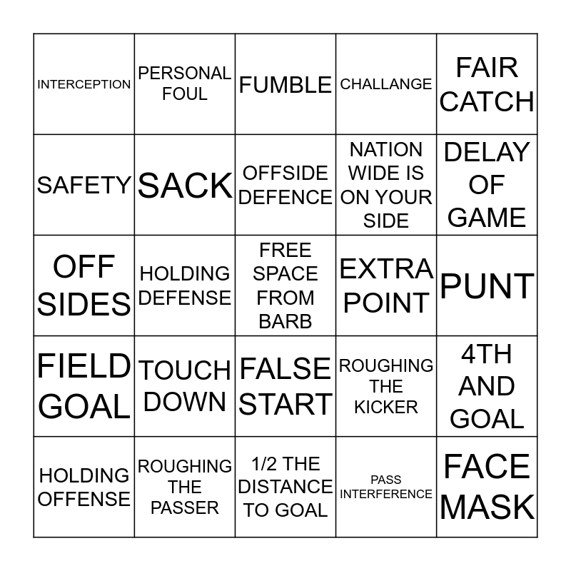 This bingo card has a free space and 24 words: TOUCH DOWN, ROUGHING THE PASSER, OFFSIDE DEFENCE, HOLDING OFFENSE, FAIR CATCH, INTERCEPTION, SAFETY, PERSONAL FOUL, EXTRA POINT, FALSE START, NATION WIDE IS ON YOUR SIDE, OFF SIDES, ROUGHING THE KICKER, 4TH AND GOAL, SACK, PASS INTERFERENCE, PUNT, FUMBLE, DELAY OF GAME, HOLDING DEFENSE, FACE MASK, FIELD GOAL, CHALLANGE and 1/2 THE DISTANCE TO GOAL.