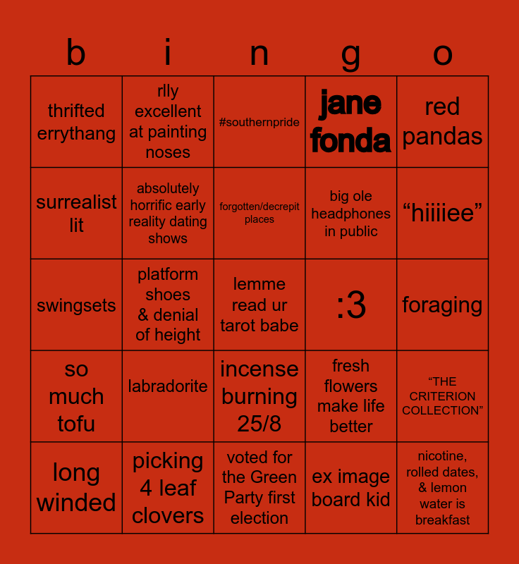 This bingo card has a free space and 24 words: labradorite, picking 4 leaf clovers, forgotten/decrepit places, long winded, red pandas, thrifted errythang, surrealist lit, rlly excellent at painting noses, :3, incense burning 25/8, big ole headphones in public, swingsets, fresh flowers make life better, “THE CRITERION COLLECTION”, absolutely horrific early reality dating shows, ex image board kid, foraging, #southernpride, “hiiiiee”, platform shoes & denial of height, nicotine, rolled dates, & lemon water is breakfast, so much tofu, jane fonda and voted for the Green Party first election.