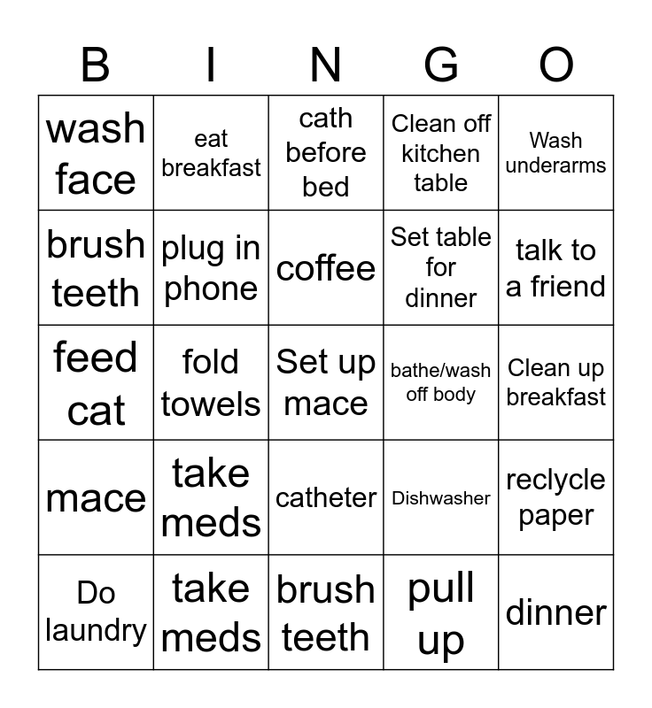 This bingo card has a free space and 26 words: catheter, pull up, coffee, take meds, Wash underarms, wash face, brush teeth, eat breakfast, Clean up breakfast, Dishwasher, Set table for dinner, feed cat, reclycle paper, Do laundry, fold towels, tidy house, Clean off kitchen table, mace, cath before bed, dinner, talk to a friend, brush teeth, bathe/wash off body, take meds, plug in phone and lay out clothes for next day.