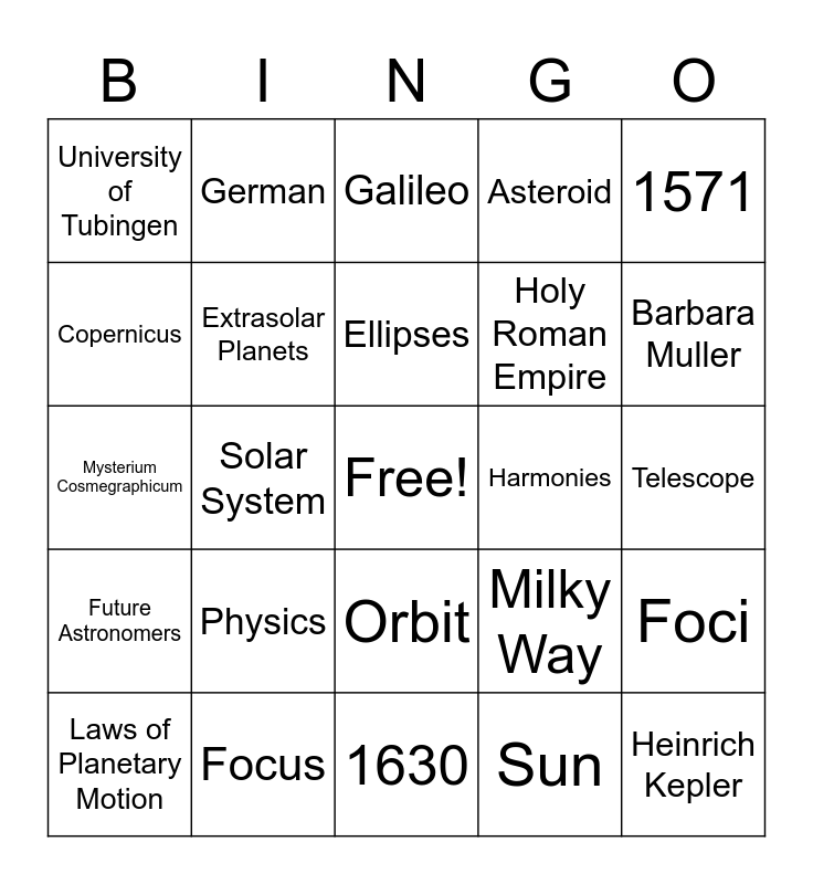 This bingo card has a free space and 36 words: Mean Distance, Tycho Brahe, Satelites, Extrasolar Planets, Milky Way, Future Astronomers, Ellipses, Mathematician, 1571, Harmonica Mundi, Solar System, Asteroid, Comet, Harmonies, Barbara Muller, University of Tubingen, Sick/Smallpox, Physics, Heinrich Kepler, Galileo, Telescope, Foci, Focus, Laws of Planetary Motion, 1630, German, Mysterium Cosmegraphicum, Isaac Newton, Holy Roman Empire, Copernicus, 1613, Perihelion, Sun, Orbit, Proportional and Axis.