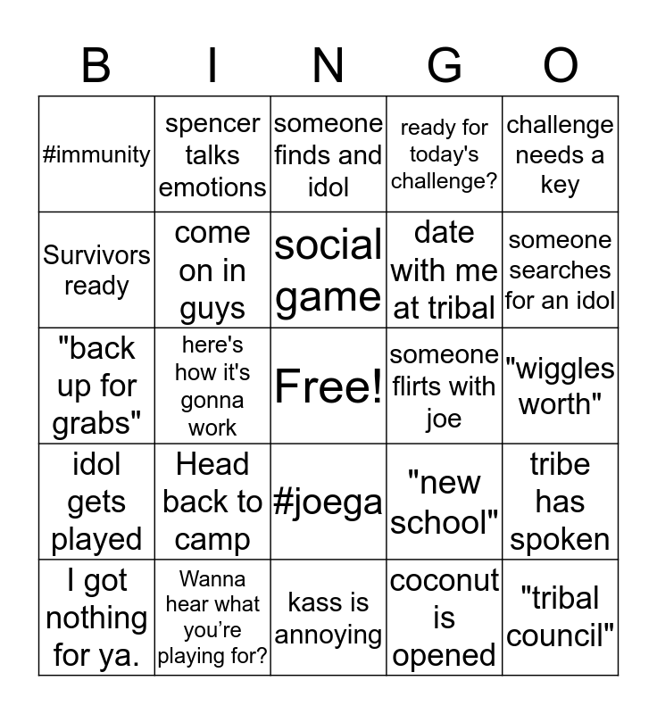 This bingo card has a free space and 24 words: Head back to camp, Wanna hear what you’re playing for?, social game, I got nothing for ya., challenge needs a key, #immunity, Survivors ready, spencer talks emotions, someone flirts with joe, #joega, date with me at tribal, "back up for grabs", "new school", tribe has spoken, come on in guys, coconut is opened, "wiggles worth", someone finds and idol, someone searches for an idol, here's how it's gonna work, "tribal council", idol gets played, ready for today's challenge? and kass is annoying.