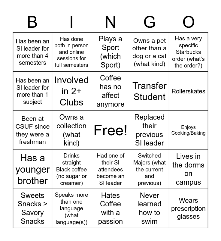 This bingo card has a free space and 25 words: Drinks straight Black coffee (no sugar or creamer), Hates Coffee with a passion, Coffee has no affect anymore, Sweets Snacks > Savory Snacks, Has a very specific Starbucks order (what’s the order?), Has been an SI leader for more than 4 semesters, Has been an SI leader for more than 1 subject, Has done both in person and online sessions for full semesters, Replaced their previous SI leader, Had one of their SI attendees become an SI leader, Transfer Student, Been at CSUF since they were a freshman, Switched Majors (what the current and previous), Lives in the dorms on campus, Involved in 2+ Clubs, Plays a musical instrument ( Which instrument), Enjoys Cooking/Baking, Plays a Sport (which Sport), Rollerskates, Owns a collection (what kind), Wears prescription glasses, Speaks more than one language (what language(s)), Has a younger brother, Owns a pet other than a dog or a cat (what kind) and Never learned how to swim.