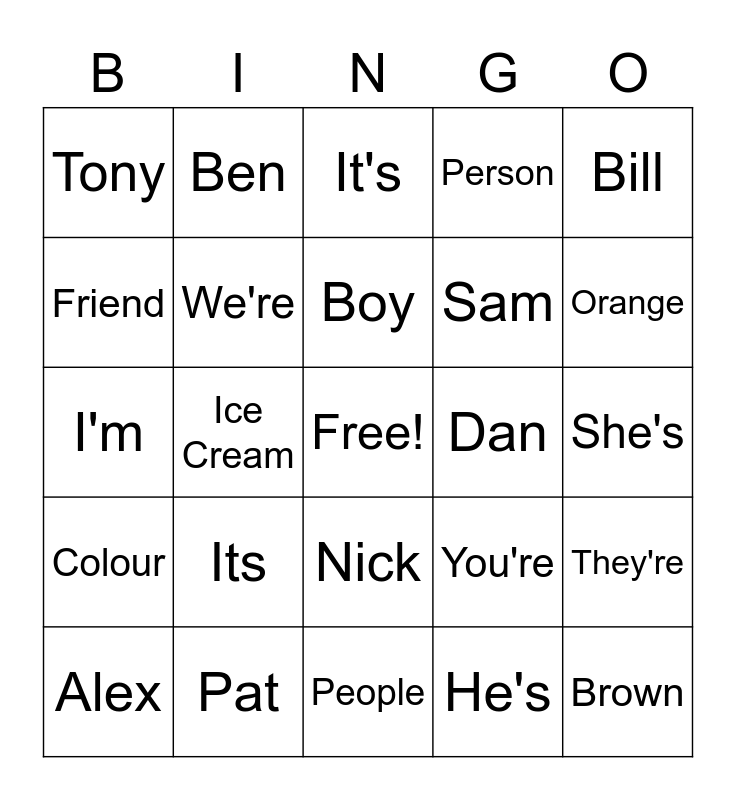 This bingo card has a free space and 24 words: Its, Pat, Boy, Alex, Bill, Tony, Friend, Ben, Dan, Nick, Sam, I'm, You're, They're, We're, He's, She's, It's, Orange, Ice Cream, Brown, Colour, Person and People.
