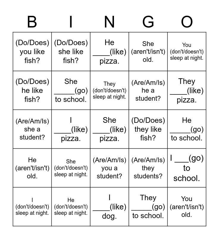 This bingo card has a free space and 24 words: She (don't/doesn't) sleep at night., He (don't/doesn't) sleep at night., They (don't/doesn't) sleep at night., I (don't/doesn't) sleep at night., You (don't/doesn't) sleep at night., (Do/Does) you like fish?, (Do/Does) he like fish?, (Do/Does) she like fish?, (Do/Does) they like fish?, (Are/Am/Is) you a student?, (Are/Am/Is) he a student?, (Are/Am/Is) she a student?, (Are/Am/Is) they students?, I ___(go) to school., She _____(go) to school., They _____(go) to school., He _____(go) to school., He ____(like) pizza., They ____(like) pizza., I ____(like) pizza., You (aren't/isn't) old., He (aren't/isn't) old., She (aren't/isn't) old. and I ____(like) dog..
