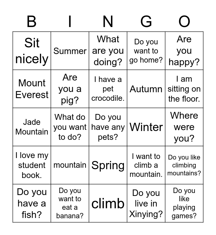 This bingo card has 25 words: mountain, climb, I have a pet crocodile., Do you have a fish?, Are you happy?, Sit nicely, Mount Everest, Summer, Winter, Spring, Autumn, Jade Mountain, I want to climb a mountain., Do you like climbing mountains?, Are you a pig?, Do you like playing games?, Where were you?, What are you doing?, I am sitting on the floor., What do you want to do?, Do you have any pets?, Do you want to eat a banana?, I love my student book., Do you want to go home? and Do you live in Xinying?.