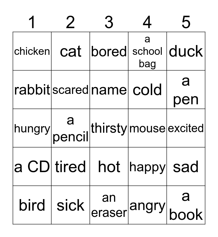 This bingo card has a free space and 24 words: tired, sick, name, bird, duck, chicken, rabbit, cat, mouse, hot, cold, hungry, happy, sad, scared, angry, excited, bored, a pen, a pencil, a book, a CD, a school bag and an eraser.