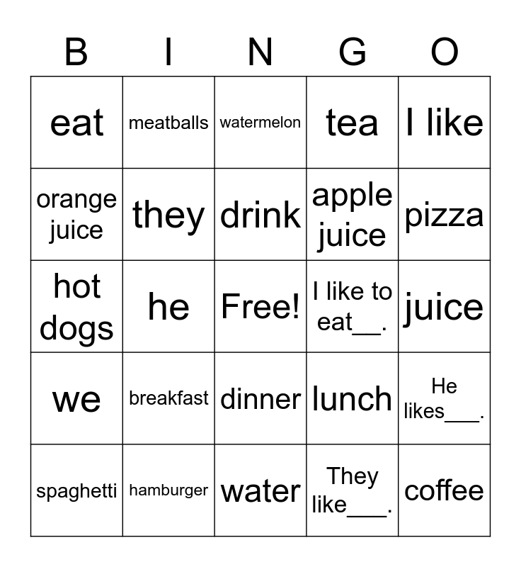 This bingo card has a free space and 33 words: I, you, he, she, we, they, I like, spaghetti, meatballs, chinese food, drink, watermelon, chicken, turkey, I like to eat__., pizza, hamburger, hot dogs, breakfast, lunch, dinner, I like to drink__., eat, juice, water, coffee, tea, apple juice, orange juice, He likes___., She likes ____., They like___. and I don't like__..