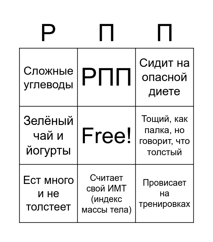 This bingo card has a free space and 8 words: Тощий, как палка, но говорит, что толстый, Сидит на опасной диете, РПП, Ест много и не толстеет, Сложные углеводы, Провисает на тренировках, Зелёный чай и йогурты and Считает свой ИМТ (индекс массы тела).