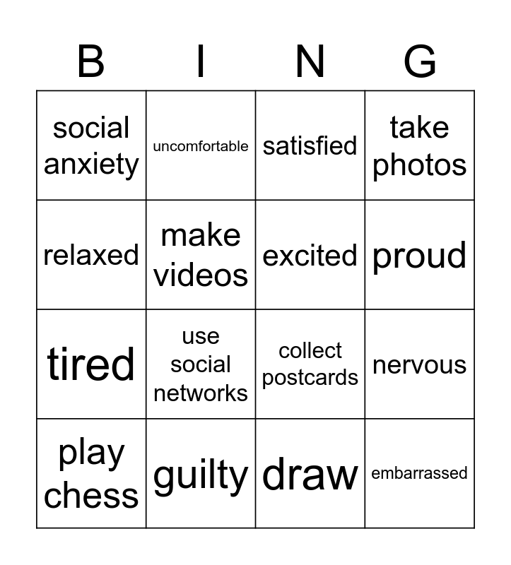 This bingo card has 16 words: guilty, nervous, satisfied, social anxiety, tired, uncomfortable, collect postcards, draw, relaxed, make videos, play chess, take photos, use social networks, proud, excited and embarrassed.