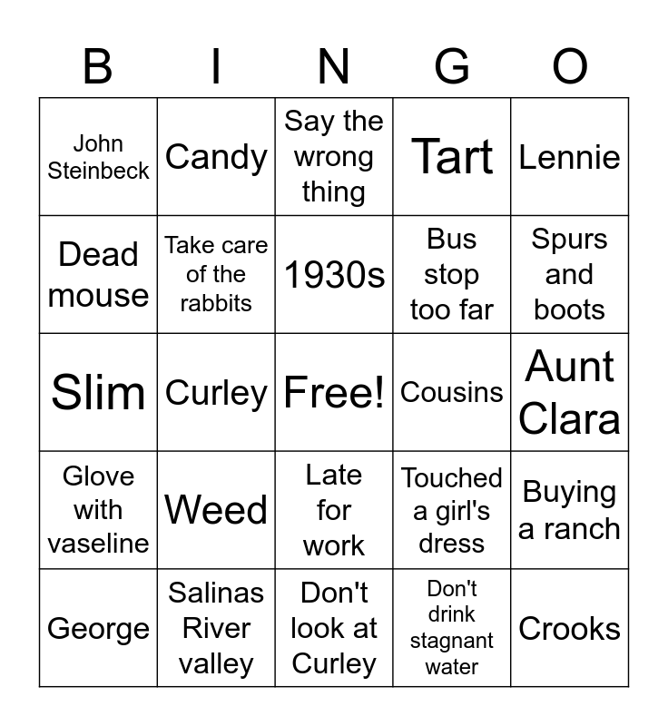 This bingo card has a free space and 24 words: Weed, Salinas River valley, 1930s, George, Lennie, John Steinbeck, Dead mouse, Candy, Cousins, Late for work, Bus stop too far, Slim, Touched a girl's dress, Buying a ranch, Take care of the rabbits, Don't drink stagnant water, Aunt Clara, Say the wrong thing, Spurs and boots, Curley, Crooks, Glove with vaseline, Tart and Don't look at Curley.