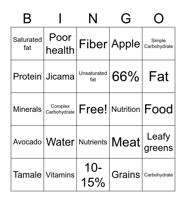 This bingo card has a free space and 24 words: Water, Vitamins, Unsaturated fat, Tamale, Simple Carbohydrate, Saturated fat, Protein, Poor health, Nutrition, Nutrients, 66%, Minerals, Meat, Leafy greens, Jicama, Grains, Food, Fiber, Fat, Complex Carbohydrate, Carbohydrate, Avocado, Apple and 10-15%.