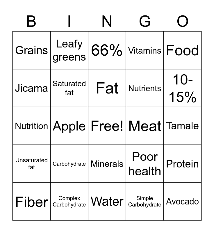 This bingo card has a free space and 24 words: Carbohydrate, Complex Carbohydrate, Fat, Fiber, Food, Grains, Jicama, Leafy greens, Meat, Minerals, Nutrients, Nutrition, Poor health, Protein, Saturated fat, Simple Carbohydrate, Tamale, 66%, 10-15%, Apple, Avocado, Unsaturated fat, Vitamins and Water.