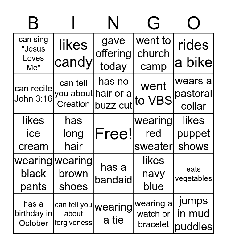 This bingo card has a free space and 24 words: wearing brown shoes, can tell you about forgiveness, has no hair or a buzz cut, has a birthday in October, rides a bike, can sing "Jesus Loves Me", can recite John 3:16, likes candy, wearing red sweater, has a bandaid, went to VBS, likes ice cream, likes navy blue, eats vegetables, can tell you about Creation, wearing a watch or bracelet, likes puppet shows, gave offering today, wears a pastoral collar, has long hair, jumps in mud puddles, wearing black pants, went to church camp and wearing a tie.