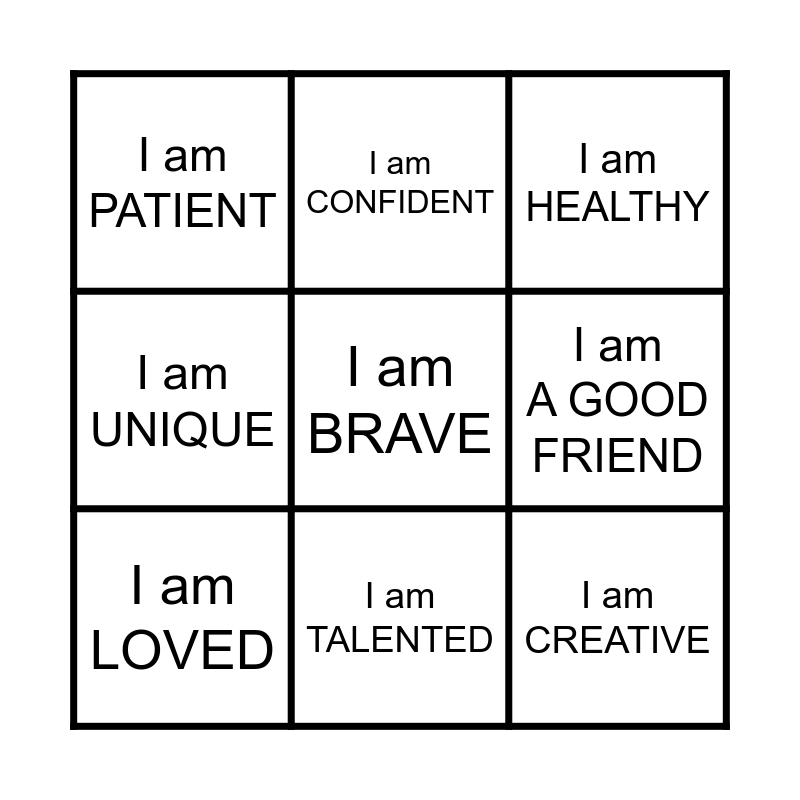 This bingo card has 14 words: I am SMART, I am KIND, I am LOVED, I am CONFIDENT, I am UNIQUE, I am BRAVE, I am CREATIVE, I am SAFE, I am TALENTED, I am PATIENT, I am GRATEFUL, I am A GOOD FRIEND, I am HEALTHY and I am AWESOME.