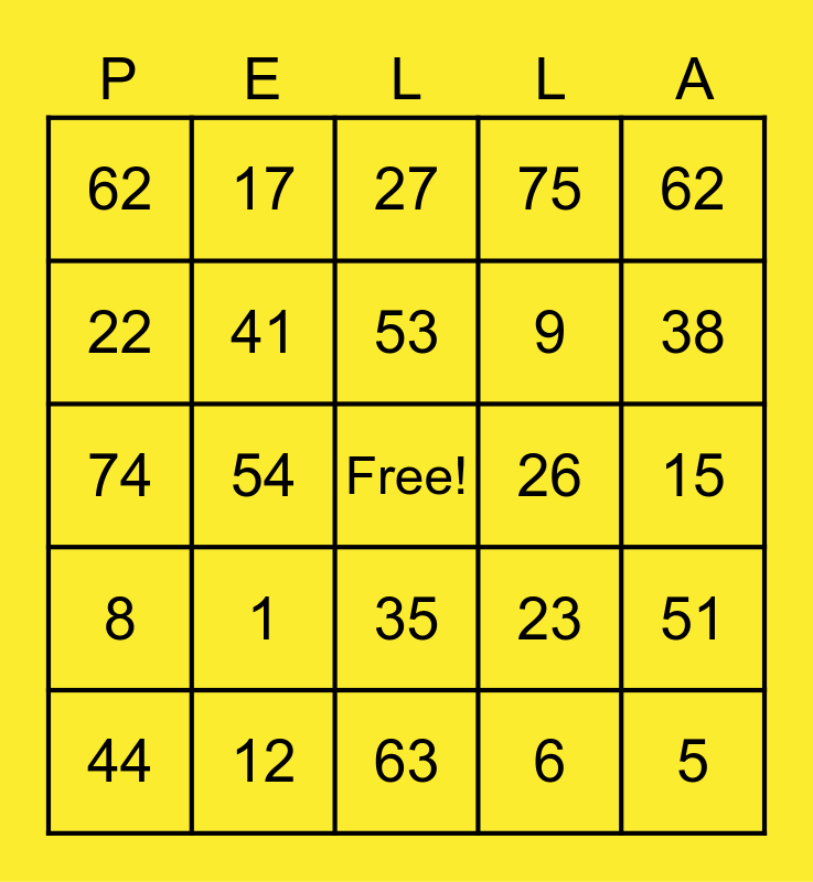 This bingo card has a free space and 24 words: 1, 12, 53, 44, 62, 62, 22, 17, 26, 35, 9, 74, 23, 51, 41, 6, 15, 27, 38, 54, 5, 8, 75 and 63.