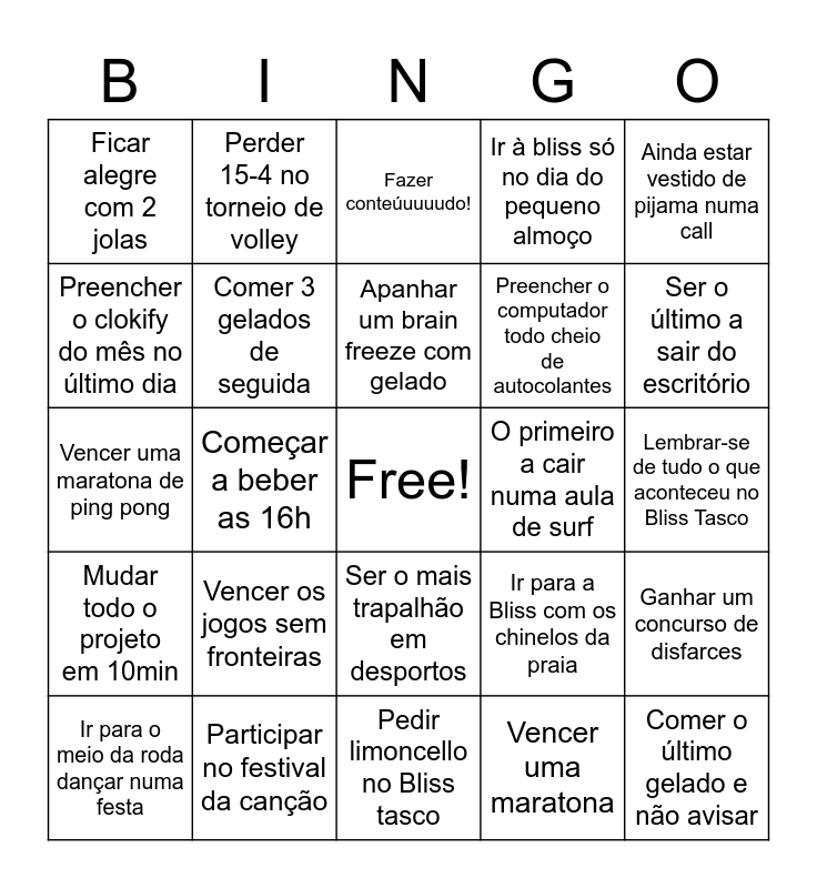 This bingo card has a free space and 77 words: Pedir fatura com NIF da Bliss, Ir ao Porto fingir que se trabalha, Fazer conteúuuuudo!, Almoçar na Mila, Passar 3h no Focus, Estragar a dieta no Mac, Dar uma mergulho na praia, Partilhar GIFs parvos no Slack, Receber emails da Ana Tomaz, Comprar frutos vermelhos (só que não), Falar mal do cliente mas adorar o projeto, Comer o pequeno-almoço ao almoço e lanche, Apanhar um brain freeze com gelado, Preencher o clokify do mês no último dia, Reportar e-mails do Diogo como spam, Começar a beber as 16h, Sentar sem marcar lugar na App blissIt, Comer o último gelado e não avisar, Esquecer se dos talheres para almoçar, Ainda estar vestido de pijama numa call, Ir pelo elevador em vez de subir as escadas, Vencer uma maratona de ping pong, Comer 3 gelados de seguida, Perder 15-4 no torneio de volley, Ir à bliss só no dia do pequeno almoço, Esquecer se de deixar o bilhete do parquímetro no carro, Ir 3 semanas para o Porto “trabalhar “, Ganhar 2 vezes o torneio de volley, Ter uma reunião numa sala reservada por outra pessoa, Ser o primeiro a esvaziar as garrafas do frigorífico, Ser o primeiro a adormecer numa viagem de team building, Saber o nome de todas as pessoas do autocarro, Andar de skate nas horas de almoço, Ir para a Bliss com os chinelos da praia, Ser o último a sair do escritório, Preencher o computador todo cheio de autocolantes, Ser o único sóbrio numa festa do Wygroup, Apanhar um escaldão ao mínimo tempo na praia, Lembrar-se de tudo o que aconteceu no Bliss Tasco, Vencer uma maratona, Recusar uma jola ao final do dia, Esvaziar a mesa do pequeno almoço, Esquecer-se de coisas no escritório, Alinhar numa saída à noite, Perder no beer pong, Contar a melhor piada, Ir para o meio da roda dançar numa festa, Ficar alegre com 2 jolas, Ser o melhor gamer, Ir ao mac e pedir salada, Ser o melhor num jogo de futebol, Ser o mais trapalhão em desportos, Criar a melhor playlist para a empresa, Vir todos os dias ao escritório, Ter um talento escondido, Criar um novo desporto, O mais estiloso, A primeira pessoa a cortar-se no dia antes do evento, Falar mais línguas, Enviar um email para o cliente errado, Vencer os jogos sem fronteiras, Criar um hino para a Bliss, Beber mais de 5 cafés num só dia, Vir ao pequeno almoço da empresa com o pequeno almoço já tomado, Chegar atrasado a uma reunião, Entrar na banda Too many requests, Fazer ski de calções de banho, O primeiro a cair numa aula de surf, Esquecer-se do carregador quando vai para o escritório, Saber todas as expressões portuguesas, Dizer uma asneira numa meeting com o cliente, Ganhar um concurso de disfarces, Mudar todo o projeto em 10min, Participar no festival da canção, Acordar as 3 da manhã e ir para um after party, Pedir limoncello no Bliss tasco and Sair de casa com mayo e perneiras para uma aula de dança.