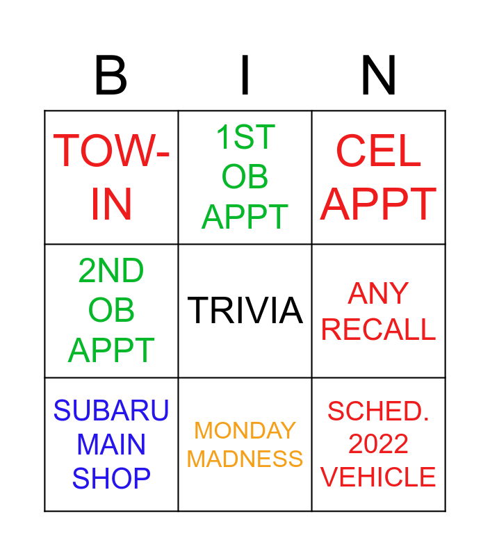 This bingo card has a free space and 8 words: ANY RECALL, CEL APPT, 1ST OB APPT, SUBARU MAIN SHOP, TOW-IN, SCHED. 2022 VEHICLE, 2ND OB APPT and MONDAY MADNESS.
