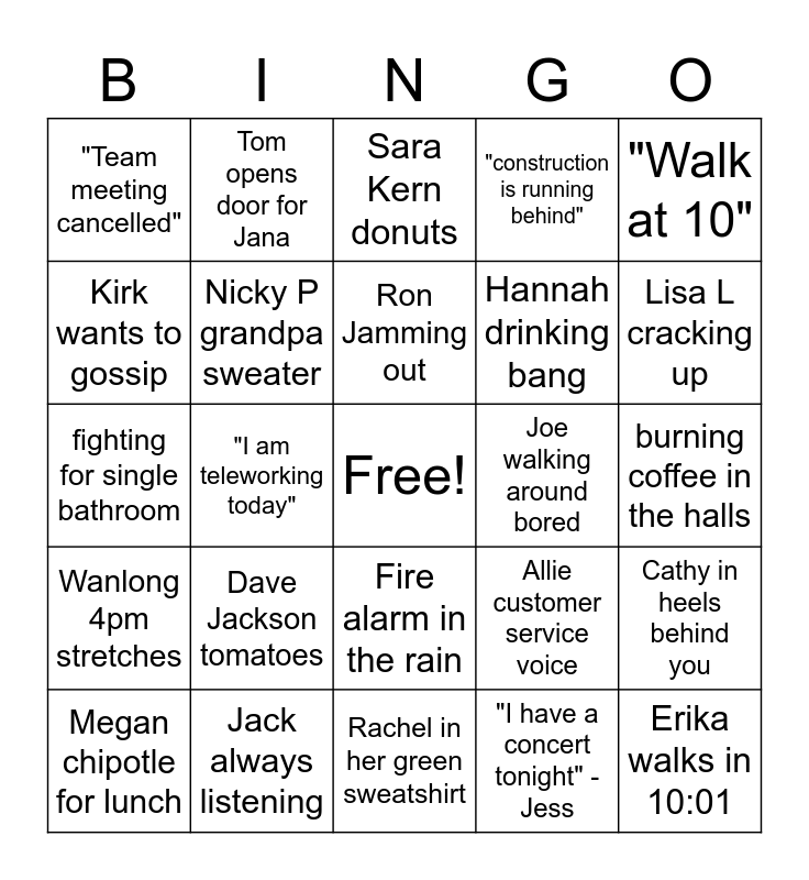 This bingo card has a free space and 24 words: Dave Jackson tomatoes, Jack always listening, Ron Jamming out, Megan chipotle for lunch, "Walk at 10", "Team meeting cancelled", Kirk wants to gossip, Tom opens door for Jana, Joe walking around bored, Fire alarm in the rain, Hannah drinking bang, fighting for single bathroom, Allie customer service voice, Cathy in heels behind you, Nicky P grandpa sweater, "I have a concert tonight" -Jess, burning coffee in the halls, Sara Kern donuts, Lisa L cracking up, "I am teleworking today", Erika walks in 10:01, Wanlong 4pm stretches, "construction is running behind" and Rachel in her green sweatshirt.