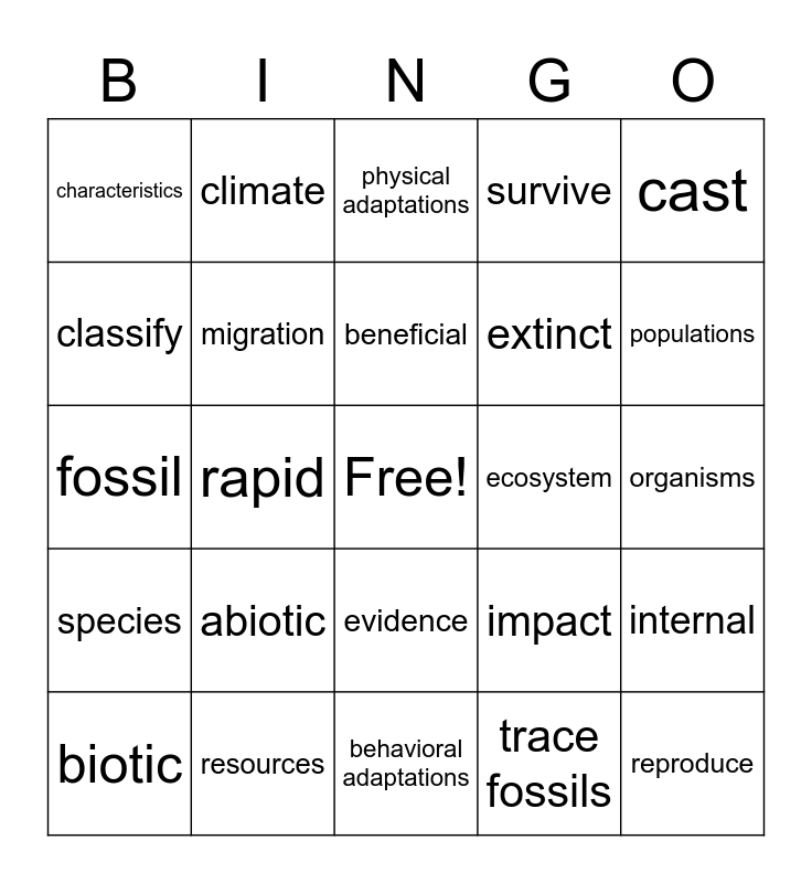 This bingo card has a free space and 25 words: abiotic, behavioral adaptations, beneficial, biotic, cast, characteristics, classify, climate, ecosystem, evidence, extinct, fossil, impact, internal, migration, mold, organisms, physical adaptations, populations, rapid, reproduce, resources, species, survive and trace fossils.