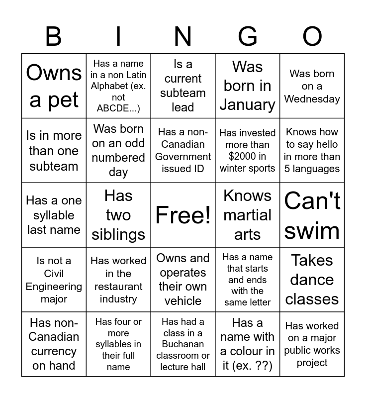 This bingo card has a free space and 24 words: Has worked in the restaurant industry, Has four or more syllables in their full name, Has a non-Canadian Government issued ID, Has non-Canadian currency on hand, Was born on a Wednesday, Owns a pet, Is in more than one subteam, Has a name in a non Latin Alphabet (ex. not ABCDE...), Knows martial arts, Owns and operates their own vehicle, Has invested more than $2000 in winter sports, Has a one syllable last name, Has a name that starts and ends with the same letter, Takes dance classes, Was born on an odd numbered day, Has a name with a colour in it (ex. ??), Can't swim, Is a current subteam lead, Knows how to say hello in more than 5 languages, Has two siblings, Has worked on a major public works project, Is not a Civil Engineering major, Was born in January and Has had a class in a Buchanan classroom or lecture hall.