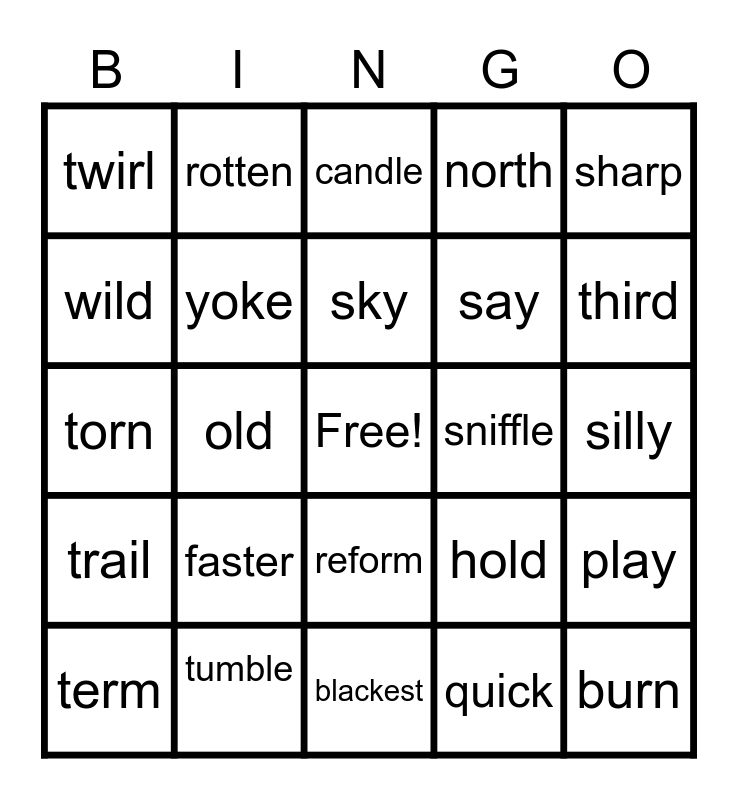 This bingo card has a free space and 24 words: faster, tumble, sky, term, sharp, twirl, wild, rotten, sniffle, reform, say, torn, hold, play, yoke, quick, silly, candle, third, old, burn, trail, north and blackest.