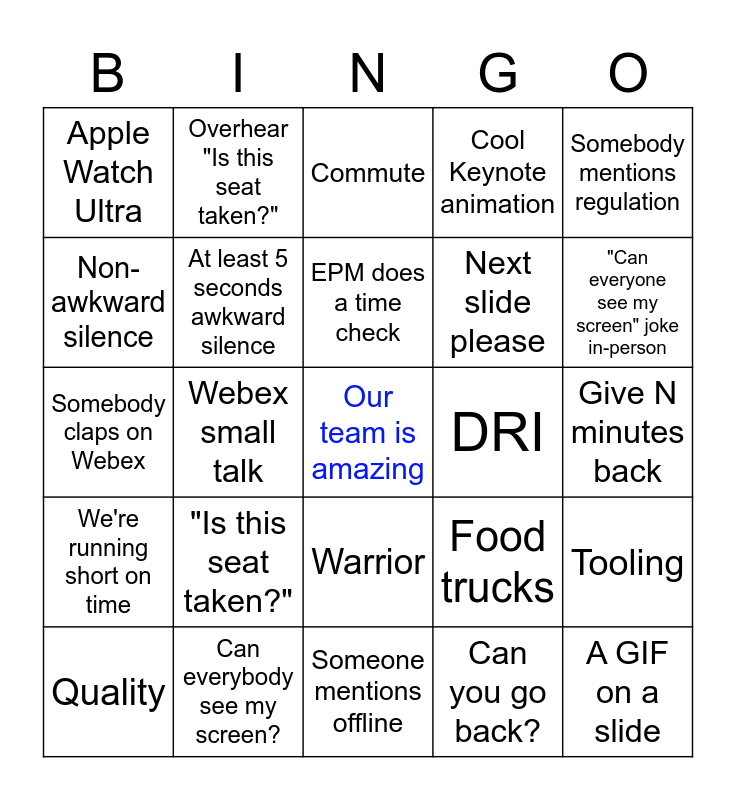 This bingo card has a free space and 59 words: You're on mute, Can everybody see my screen?, Can you mute?, We're running short on time, Can you go back?, You hear background noise, At least 5 seconds awkward silence, Sorry, you cut out, Next slide please, When at least 2 Matts talk, Cool Keynote animation, In-person conversation disrupts meeting, Non-awkward silence, International Orange, Dynamic island, Apple Watch Ultra, A GIF on a slide, Somebody mentions regulation, I need coffee, EPM does a time check, DRI, Commute, Quality, Tooling, Somebody shares their entire screen, Automation, rdar://1000000000, Somebody reacts with a fire emoji, "Can everyone see my screen" joke in-person, Somebody mentions Star Wars, Somebody claps in-person, The All-Hands comes up, Chef Krumb comes ups, Sweet treats, Overhear "Is this seat taken?", Someone needs to mute, Keynote malfunction, Webex small talk, Someone named Chris talks, Somebody claps on Webex, Somebody shouts Bingo, "Is this seat taken?", Give N minutes back, Flexible work arrangements, Notification on shared screen, "One more thing" reference, The future of health is on your wrist, Birds of Paradise, Warrior, Someone mentions offline, 3 little piggies reference, Vending machines reference, Harry Potter, San Diego, The 70's, Food trucks, Wristbands, Plushies and Salad line.