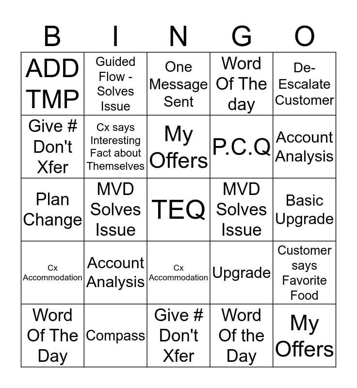 This bingo card has a free space and 24 words: Account Analysis, Compass, My Offers, Word Of The Day, De-Escalate Customer, ADD TMP, Give # Don't Xfer, Guided Flow - Solves Issue, MVD Solves Issue, Cx Accommodation, P.C.Q, Plan Change, Upgrade, Customer says Favorite Food, Cx says Interesting Fact about Themselves, Word Of the Day, Basic Upgrade, One Message Sent, Account Analysis, MVD Solves Issue, My Offers, Cx Accommodation, Word Of The day and Give # Don't Xfer.