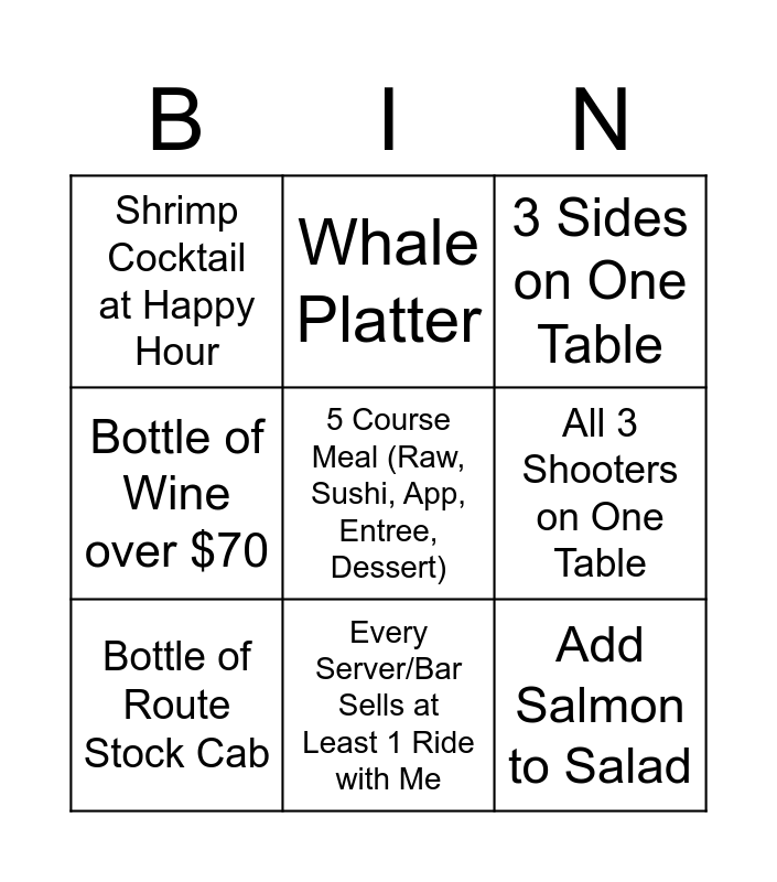 This bingo card has a free space and 8 words: All 3 Shooters on One Table, 3 Sides on One Table, Whale Platter, Bottle of Route Stock Cab, Shrimp Cocktail at Happy Hour, Add Salmon to Salad, Bottle of Wine over $70 and Every Server/Bar Sells at Least 1 Ride with Me.