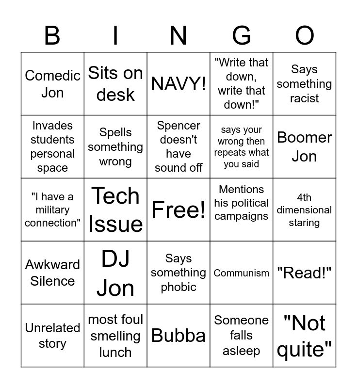 This bingo card has a free space and 24 words: DJ Jon, most foul smelling lunch, Spencer doesn't have sound off, Unrelated story, Says something racist, Comedic Jon, Invades students personal space, Sits on desk, Mentions his political campaigns, Says something phobic, says your wrong then repeats what you said, "I have a military connection", Communism, "Read!", Spells something wrong, Someone falls asleep, 4th dimensional staring, NAVY!, Boomer Jon, Tech Issue, "Not quite", Awkward Silence, "Write that down, write that down!" and Bubba.