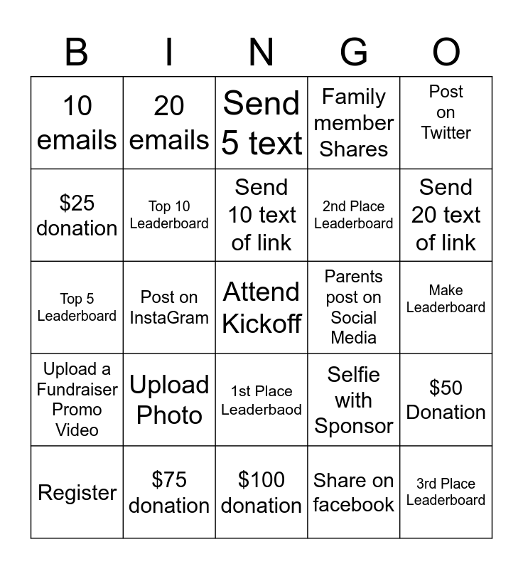 This bingo card has a free space and 24 words: Register, Upload Photo, Send 10 text of link, Share on facebook, Post on Twitter, 10 emails, 20 emails, Send 5 text, Parents post on Social Media, Make Leaderboard, Top 5 Leaderboard, Top 10 Leaderboard, Selfie with Sponsor, $50 Donation, $25 donation, $75 donation, $100 donation, Family member Shares, Send 20 text of link, Upload a Fundraiser Promo Video, Post on InstaGram, 1st Place Leaderbaod, 2nd Place Leaderboard and 3rd Place Leaderboard.