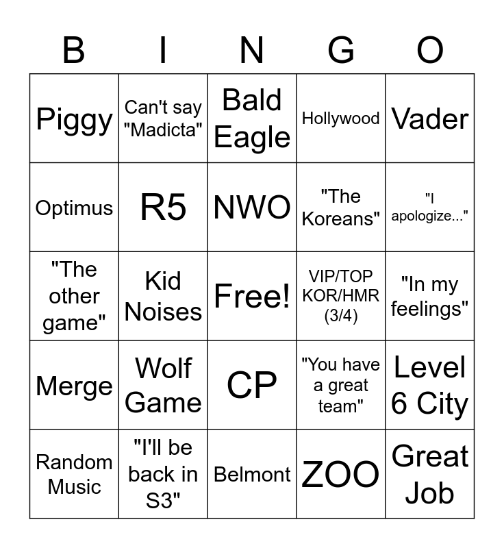 This bingo card has a free space and 24 words: Wolf Game, "I'll be back in S3", NWO, Random Music, Vader, Piggy, Optimus, Can't say "Madicta", VIP/TOP KOR/HMR (3/4), CP, "The Koreans", "The other game", "You have a great team", Level 6 City, R5, ZOO, "In my feelings", Bald Eagle, "I apologize...", Kid Noises, Great Job, Merge, Hollywood and Belmont.
